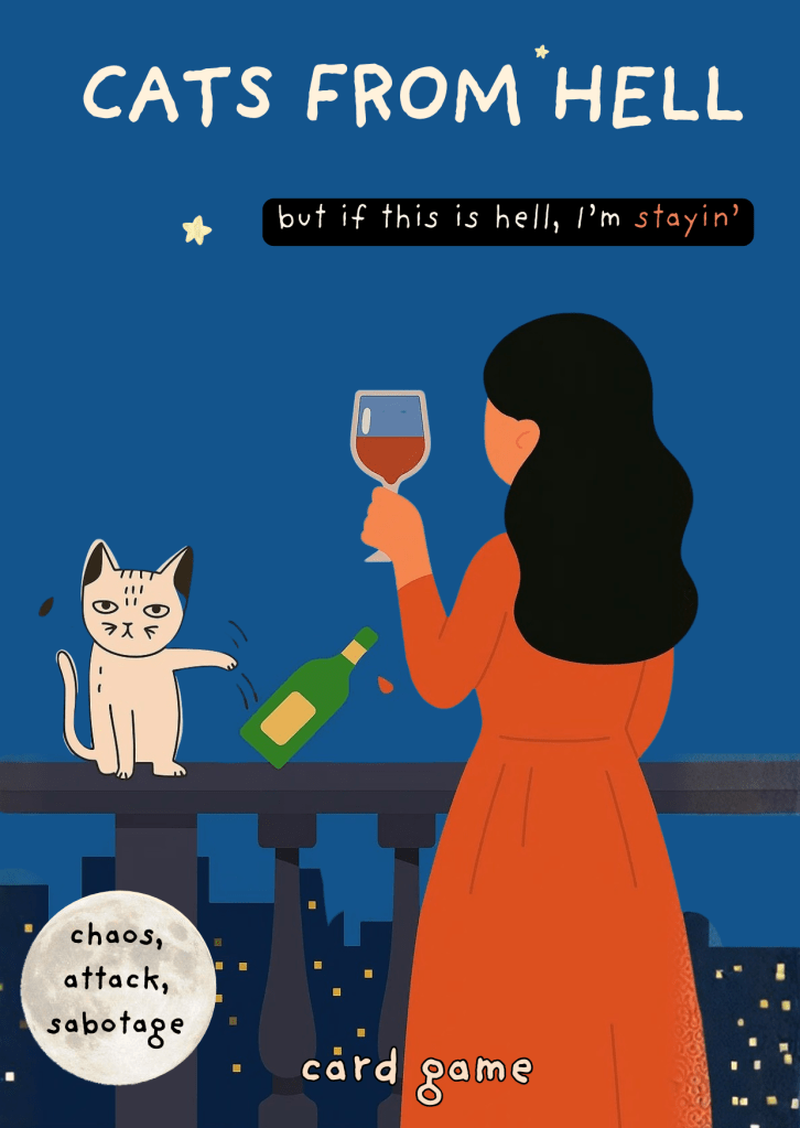 Cats From Hell is a fast, silly, joyfully chaotic card game where the goal is simple: get through your day. The problem? Cats. Your cats, other people’s cats, imaginary chaotic cats, basically a furry army determined to destroy your plans. So… real life, but funnier.